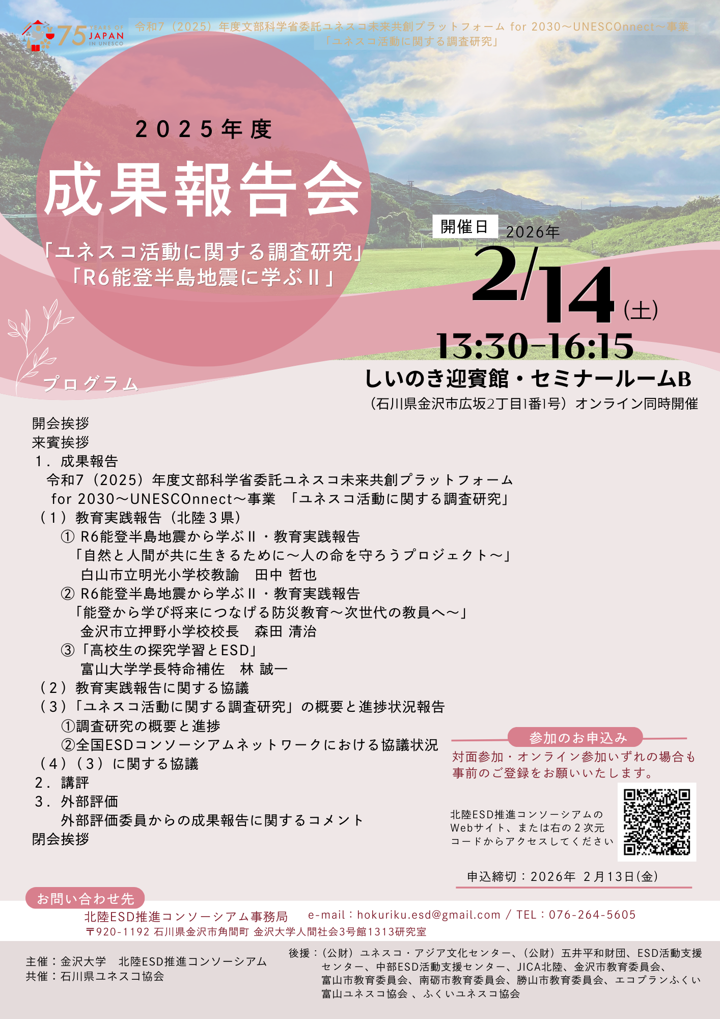 並びに北陸におけるユネスコスクール等が取り組む「ESD for 2030」を進める授業実践及び教育活動の状況並びに文部科学省委託事業として行う「ユネスコ活動に関する調査研究」事業(※)等についての報告会を開催いたします。